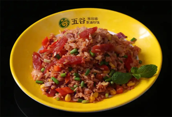 五谷易拉罐茶油炒饭品牌介绍: 五谷易拉罐茶油炒饭为核心,融汇擂椒拌饭、网红盖码饭、懒人焖饭,打造四饭合一的中国新饭局。五谷易拉罐茶油炒饭,智能机器人摇滚炒饭工艺,国宴大师料理配方,天然健康茶油配方技术,创新易拉罐包装器皿,开启炒饭外卖+堂食全营销新格局!五谷易拉罐茶油炒饭精选优质的擂辣椒,再配上新鲜颗粒饱满的米饭,搅拌在一起,混合了辣味、甜味和米饭的香味,丰富的味蕾层次让人垂涎欲滴。擂椒的美味不仅在于辣味爽口,而且对食材的包容性极强,和多种配料搭配都能很好的融合。 三大爆款炒饭,七大世界炒饭名品,十八种网红炒饭,共同组成五谷易拉罐茶油炒饭新快餐的完整产品链,既满足各地域消费口欲,更满足开店创业全方位需求,打造店铺与外卖双线盈利新潮炒饭店铺。五谷易拉罐茶油炒饭推出了梅菜扣肉擂椒拌饭、卤肉擂椒拌饭、腊肠擂椒拌饭以及炒肉擂椒拌饭等多种口味的拌饭组合,即开胃又下饭,独特的浓郁香味,闻到就想吃,无论是卖相还是口感,都是极品,专治食欲不振。