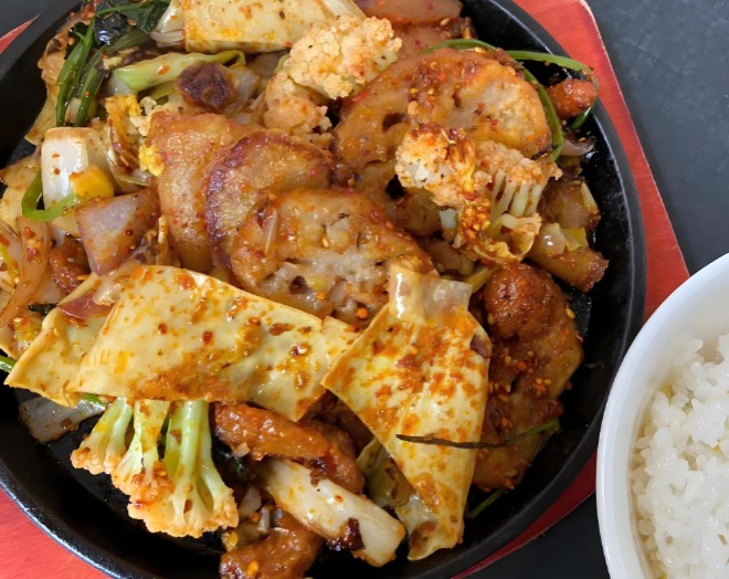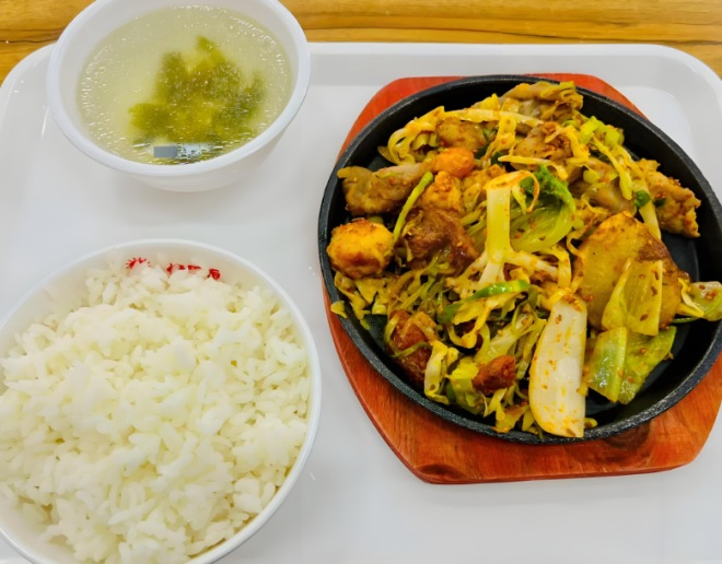 金日升烤盘饭这里的烤盘饭真的是自选模式,想吃什么就夹什么!鸡胸肉、牛肉、培根、甘薯条、金针菇、土豆片……种类超级多,分量也很足! |