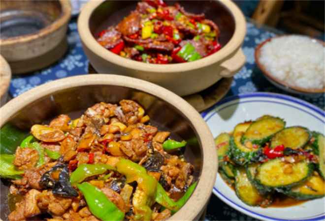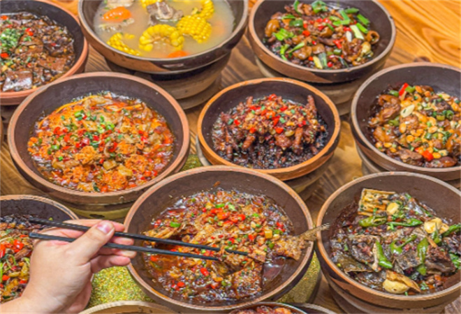 走进这家钵子村小钵子湘菜店内,几乎每晚都能看到充满烟火气的热闹景象:食客围炉而坐,桌上炖着几个热气翻腾的钵子,钵内汁浓味鲜、香气四溢,大家推杯换盏,吃得酣畅淋漓,满面皆是过瘾与畅快之色。木耳辣子鸡、古法老姜肉片汤、辣白菜牛肉、碎栗子煨排骨、黄瓜玉米肠、牛角红椒瘦肉条、酱油土豆丝炒香肠、土胡萝卜炒肉、农家酸菜肉沫豆腐汤、蒸肉饼、青辣椒炒肉、蒸湘西腊鱼、干豆角蒸腊肉、柴火腐竹烧肉、红枣蒸南瓜、小钵子甜酒等菜品,满足食客需求。“常德钵子菜”即是一种餐饮形式,又是一种美味佳肴,也传承着一种古老的饮食文化。 |