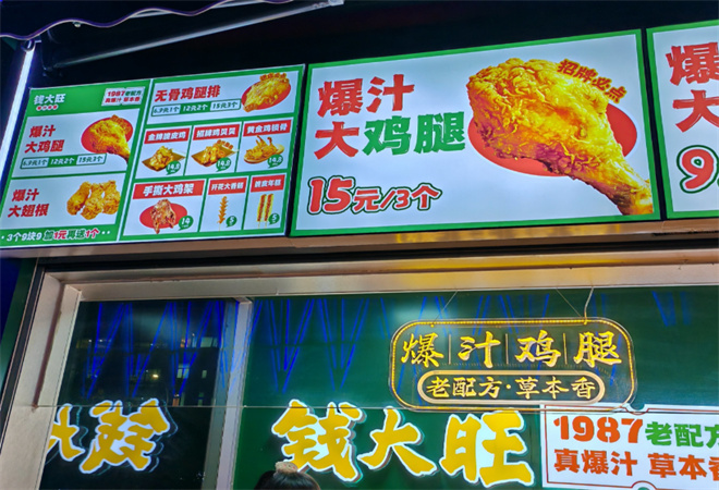 钱大旺爆汁鸡腿品牌介绍: 钱大旺爆汁鸡腿获得无数顾客的好评,短短1年时间,品牌也不断成长积累,产品不断更新升级,抖音&小红书也有许多忠实的粉丝。中式炸鸡,治愈每一天。一口爆汁,满嘴是魂。金黄焦脆皮下藏着会跳舞的肉汁,滚烫肉汁在舌尖炸开瀑布,脆皮咔嚓声真的太上头了。咬开外面那层脆壳,“咔嚓”一声,内里鲜嫩的肉与唇齿相依,吃大鸡腿的幸福就莫过于咬下的这一口。钱大旺独创的招牌,当鲜嫩的鸡肉经过牛奶和鸡蛋的洗礼,炸成金黄酥脆的样子,外皮轻薄咔嚓脆裂,肉质被牛奶驯化得细腻多汁。一整个东北生炸大鸡架的含金量,焦香酥脆,微微的带着点甜口。 钱大旺爆汁鸡腿匠心制造出的美味让每个顾客都欲罢不能。钱大旺爆汁鸡腿做生意就认这三条一是味道好吃,二是价格便宜,三是份量扎实。钱大旺爆汁鸡腿让更多人一起分享美味。钱大旺爆汁大鸡腿,成立于2024年,总部位于宁波,是由一群充满理想、热爱生活的年轻人创立的中式炸鸡品牌,从让更多的人用亲民的价格体验到品质更好的中式炸鸡。