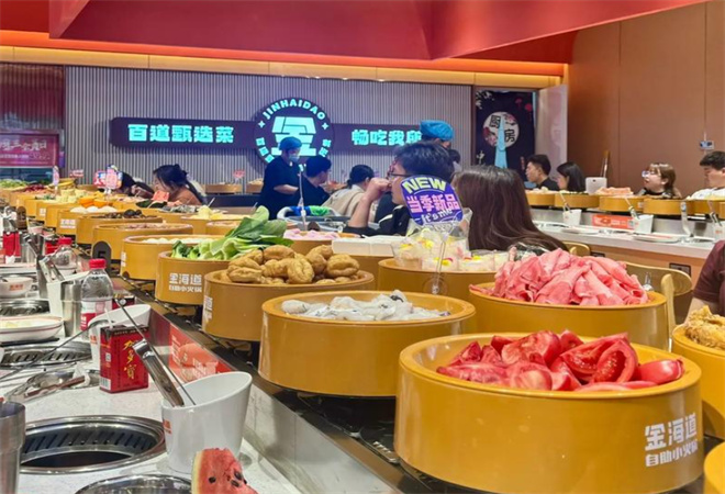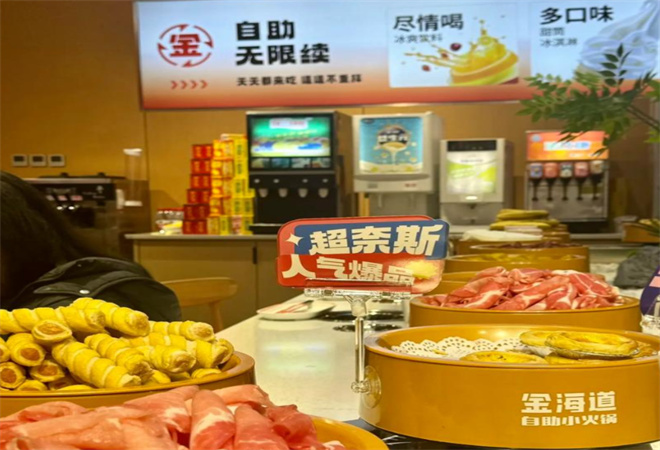 金海道自助小火锅品牌介绍: 金海道自助小火锅在食材上主打鲜为主,汤鲜、料鲜、食材新鲜。既具备了快餐的高效,又具备轻社交功能,消费场景多样化,口味和食材的丰富性高,可以让消费者高频的消费。锅底选择多多,麻辣、番茄、藤椒、金汤、菌汤,应有尽有。菜品也是丰富到不行,肉类、蔬菜、海鲜、豆制品、菌菇、水果,新鲜得让人流口水!还有热腾腾的炸食,比如超爱的炸蟹柳,直接吃就美味极了! 五花肉、培根...还有各种素菜,转盘上的美味随你挑,想吃啥就吃啥,简直太爽了!特别推荐炸鸡配蛋挞,还有那香酥的鱼饼,每一样都让人回味无穷!百种食材不限量畅吃,性价比超高,人均只需五十多块就能吃到饱,绝对是吃货们的福音!你可以尽情品尝各种海鲜,比如巴沙鱼、鱿鱼、大虾等,还有鲜嫩的牛蛙、脆爽的鸭肠、正宗的潮汕牛肉丸等。所有食材都非常新鲜,而且都是无限量供应,只要不浪费,你就可以尽情享受自助火锅美食的盛宴。
