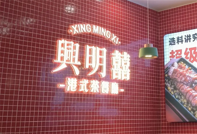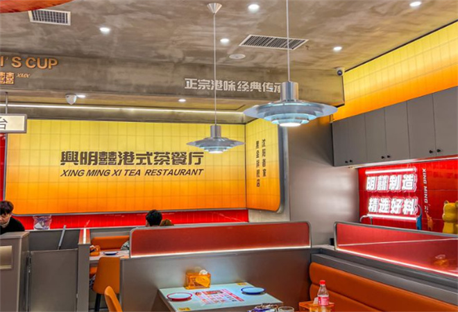 兴明囍茶餐厅品牌介绍: 兴明囍茶餐厅,融合了富有香港特色的多元化美食,烧味,饮品,面包,100+种港式茶冰厅美食,从正宗港式奶茶到各类街头小吃,都是超正宗的滋味,身处其中,让你随时体验老香港小吃街的市井风味和人情!经典复古的橙色餐厅风格,让人重拾80年代质朴纯真的市井风情!街头Slogan,霓虹灯,麻将牌,店里的处处景色与物件,都带着时光的记忆!像是走进了电影里!港式烧鸭,轻薄的鸭皮,焦香酥脆,咸香的鸭肉,细嫩多汁,再裹上一层秘制酸梅酱入口,增加几分酸甜清冽,连着肉香在舌尖一同弥漫开来,那感觉简直不能在妙了鸭! 饱饱菠萝包,香脆松软的菠萝包,加入香煎午餐肉、炒滑蛋、番茄片、进口芝士片,入口番茄片和午餐肉汁水在口中爆开,芝士在唇齿间融化,口感有层次又极度协调。蜜汁铁板叉烧,甄选上等梅肉,烧至恰到好处。上桌之后浇汁,滚烫的铁板瞬间煮沸酱汁,蜜香扑面而来,甜美的酱汁在叉烧上流连,瘦肉不柴,肥肉不腻。冰爽柠檬茶,茶底清新爽口,搭配的进口柠檬,放在杯子上就已经浓郁飘香,这两个简单的食材融合在一起,清爽解腻的绝佳单品。夏日必点。金不换三杯鸡、蒜蓉唐生菜、咖喱黄金鱼蛋等菜品,满足食客需求。