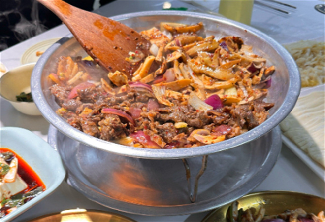 孙小木铝盆烤肉主角是一个——锃光瓦亮的铝盆!下面点上几块固体酒精块,这就是全部装备了!别小看这组合,火力集中升温快,烤出来的肉带着一种原始、直接的焦香,油脂滴在盆底滋滋作响,香气瞬间炸开,比任何高级烤炉都更让人食欲暴动!操作简单,自己动手翻烤,参与感满分!与传统烤肉不同,铝盆能锁住肉的汁水,烤出的肉更加细嫩。尤其是主菜半斤八两,好大一份,肉搭配酸菜,味道层次丰富。吃完还能加汤煮面片,一碗下肚,幸福感爆棚。手工面片现拉现煮,师傅抻面的动作行云流水,面片筋道入味,浸满肉香汤汁绝绝子!