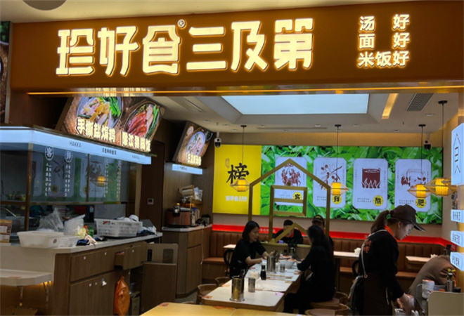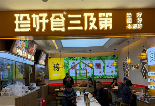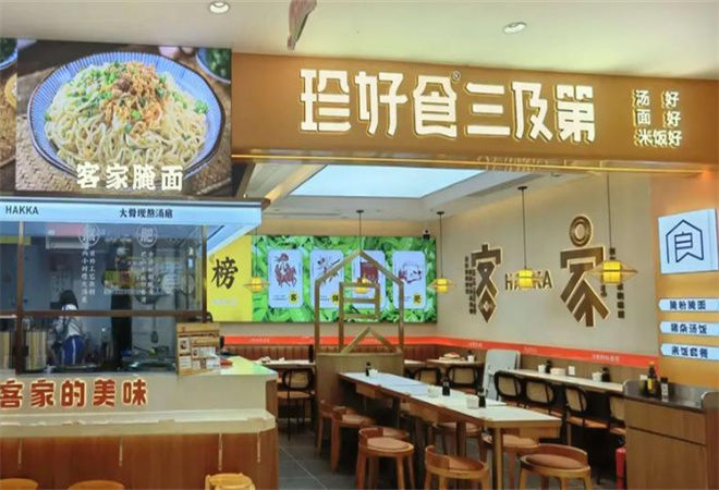 珍好食三及第快餐品牌介绍: 珍好食三及第汤以白粥为底,搭配滑嫩猪瘦肉、粉糯猪肝、脆爽猪粉肠,淋秘制生抽,撒葱花,配客家腌面,突出碳水+肉香的双重口感。三及第汤是一道传统的客家小吃。状元、榜眼、探花在殿试中分别获得第一名、第二名和第三名,合称为三及第。清朝状元林召棠用猪肝、瘦肉和猪肚子来比喻这三及第,因此得名三及第汤。客家人将三及第配上枸杞叶、咸菜等食材,加入几滴酒糟,熬制出味道鲜美的三及第汤。一碗三及第汤搭配一大碗腌面,是许多客家人的早餐首选。 珍好食芥兰车螺汤,车螺汤清甜可口,芥兰又脆又嫩,正!卤鸡腿,鸡腿卤得入味,一口咬下去,满口都是肉香。热卤翅尖,翅尖小小个,但味道十足,吃得停不下来豉汁排骨,排骨豉汁味浓,肉质鲜嫩,真是下饭好菜。炒面镬气十足,猪肉汤清澈却有回甘,都是客家人认证的家乡味。重点是均价20+就能吃饱!