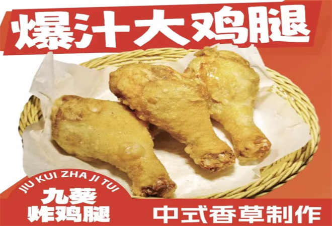 九葵炸鸡腿品牌介绍: 九葵炸鸡腿创始团队经过多年的市场走访,取得了某技艺后人的支持,获得其古法配方,采用传统的“干炸”技术,揉捏清洗,祖传中式调料腌制,轻裹秘制挂糊,精选大豆油炸制,不使用起酥油,一次成型不复炸,严格的火候和高超技艺充分融合的方式,解决了食物不入味,鸡肉不鲜嫩,腥味重,吸油多,表皮口感不酥脆等行业痛点。 在西式、韩式炸鸡风靡盛行的当下,九葵制作的炸鸡腿,色泽金黄、外酥里嫩、入味适口、一口爆汁的特点,独具特色。同时公司秉承“合作商赚大钱、公司赚小钱”的经营理念,让合作商以最低的投入,轻装上阵,没有负担,并快速获得最大的回报,真正做到“小项目、大连锁”。“九葵炸鸡腿”将继续以匠人的精湛姿态,推陈出新,将中式古法美食带向全国,同时肩负输出中国文化的重要载体,继而走向全世界。