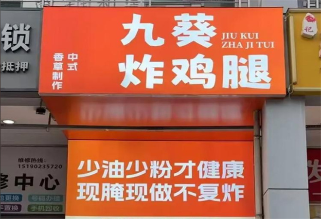 九葵炸鸡腿品牌优势: 健康、诱人、鲜香 选用大品牌圣农的鸡肉 肉质鲜嫩易入味,炸鸡腿外皮色泽金黄,内里鲜香多汁,确保更大程度营养留存,顾客争相排队购买,复购率高。 选用品牌大豆油拒绝起酥油 让食品更健康,坚决不使用干滚油,只为食客健康考虑。 传承百年秘制调味技法 选用天然香料,手工调味,挂糊更均匀,香味层层渗透至鸡肉里,鸡腿充分入味,激发纯正内香,令人食指大动。