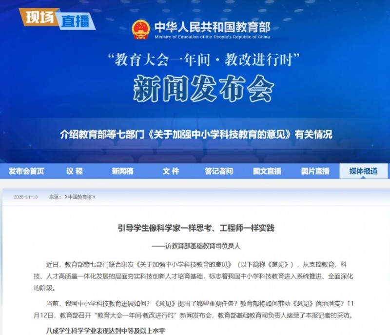 前言 |政策红利释放,科学教育赛道迎来新机遇 “引导学生像科学家一样思考、工程师一样实践。” 这句出自教育部等七部门最新印发的《关于加强中小学科技教育的意见》中的表述,正在教育界引发广泛讨论。 2025年11月12日,教育部召开“教育大会一年间·教改进行时”新闻发布会,介绍了这份重磅文件的相关情况。该《意见》标志着我国中小学科技教育进入系统推进、全面深入的阶段。 教育部基础教育司负责人在接受《中国教育报》采访时指出,当前国家义务教育质量监测结果显示,八成学生科学学业表现达到中等及以上水平,但同时也承认“学生综合素养和实践能力还有待提高”。 PART1 政策导向:从“知识传授”到“科学家思维”培育 《意见》的发布,为中小学科技教育指明了新方向。文件强调要遵循学生认知发展规律,加快建设协同贯通的育人体系,分阶段、系统化地帮助学生培养科学兴趣、学习科学方法、培育科学精神。 具体实施路径包括: 小学低年级通过生活化、游戏化情境,点燃和呵护好奇心 小学中高年级引导学生在“做中学”中深化概念理解 初中阶段聚焦真实问题解决,开展跨学科项目式学习 高中阶段鼓励学生接触科技前沿,进行实验研究和工程实践 这种教育理念的转变,正是奇趣科学多年来坚持的教学方向。 PART2 奇趣科学:“科学百年”环节与政策要求高度契合