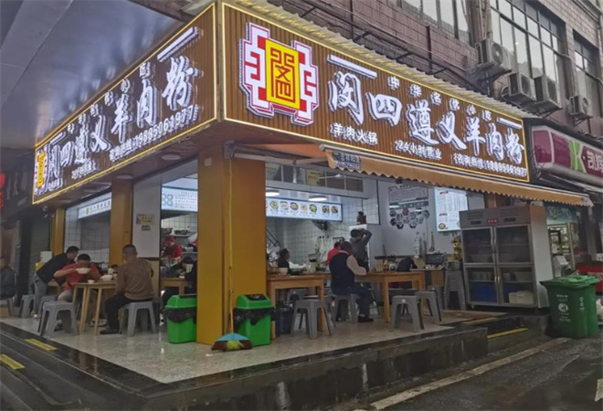 闵四遵义羊肉粉品牌介绍: 一碗闵四遵义羊肉粉,从烫粉、浇汤到最后喝一口汤,并不会花多少工夫,也不妨碍赶时间的您在果腹的同时,让舌尖好好享受这一番“舒服”的美味,汤可暖胃,辣可提神。闵四遵义羊肉粉的理念是:既要传承,也需要改进。通过向前辈请教,到外地取经,琢磨经验,大胆尝试使用新的食材、改良配方,调整制作方法。这才有了今天汤鲜肉嫩、粉滑辣香、浓郁醇厚的一碗闵四遵义羊肉粉。一门手艺的生命力,正是在于对传统的继承和升华,随着时代而流变的美味,也正在适应着这个时代...... 一口锅一只羊。定制的大锅,直径一米有余,汤水及锅口,羊肉、羊杂、羊骨尽在其中。大伙猛冲,再改小火慢熬。羊选用遵义地区放养山羊,(羊肉性温,具益肾补虚、开胃健脾、固本培元之效)。药使用超过100种中草药,打成粉末,装入布袋,投入汤中。从祖辈起,每天一锅汤,炭火要熬制24小时,药包的味道与药效逐渐融入汤中,火候够了,汤就成了。而如今的设备,大大提高了效率,这才跟上了现代的生活节奏。羊汤清而不浊,鲜美回甘。而此时盖上一层秘制辣椒油,汤色立马一片鲜红。只消长勺一拨,红汤与清汤便泾渭分明。