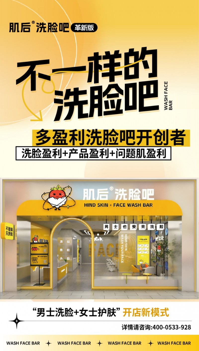 肌后洗脸吧溯源: 随着80、90、00后消费主力崛起,他们有鲜明的自我意识,在日常的消费生活中,“我”是最优先考虑的因素,我喜欢、我选择、我想要,崇尚“简单、快乐,新鲜、个性”。 肌后洗脸吧以契合现时代消费需求,新定义极简式轻美容业态理念,推崇“不推销、只洗脸”,深耕面部清洁、护理、养肤的快捷美容生活方式。结合互联网流量赋能+专业多功能美容一体设备,打造一个“平价,快速、便捷、轻松、快乐的消费场景。