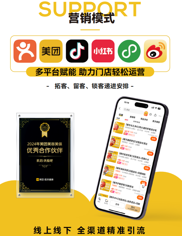 洗脸吧5大优势 1.市场广大 男性市场蛋糕,40%男性顾客、60%女性顾客,男人爱去的美容店。 2.轻资创店 投资轻,门槛低,3张床、3台仪器即可开店。 3.高效焕颜 简单、快捷、高效。每项服务只需40-50分钟,用更少时间达到美容院同等效果。 4.人力易培 员工易招聘、易上手、易复制,3-5天培训即可上岗,拥有标准化服务流程和管理制度。 5.多样推广 互联网赋能,适合嫁接抖音、美团、大众点评、公众号等平台,打造网红门店,提升经营效率。