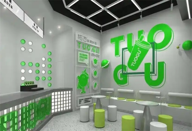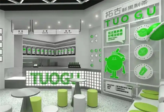 拓古制茶品牌介绍: 拓古制茶秉承“做好古朴的东方好茶”的初衷全系列贯彻“好主张”与“0添加”理念执着追寻茶饮的原始茶香与纯粹魅力。春序、夏繁、秋收、冬藏;插花、焚香、作器、烹茶;四时野趣,皆得其时宜。我们是冰博克鲜萃奶茶领导者。秉承对自然之美的追寻,我们在崇山峻岭中精选天然茶叶,并以冰博克工艺淬炼醇鲜奶源,每一滴拓古制茶,都在执着追寻茶饮的原始醇香与纯粹魅力。原叶抹茶为底,醇香牛乳与绵绵奶麻薯融合,软糯顺滑,奶香浓郁,再加上馥郁香甜的芒果肉,茶香、奶香与果香交融,口感丰富,一口大满足。 拓古制茶提供多个就餐区域,配备时尚悠闲的座椅,营造出轻松愉快的氛围。餐桌采用现代简约风格,餐椅颜色呼应品牌主色调,墙面装置呼应拓古品牌理念,茶星球元素,2.5维墙画的元素显得整个空间年轻化,整体空间氛围往年轻化、潮流化的趋势去做设计。