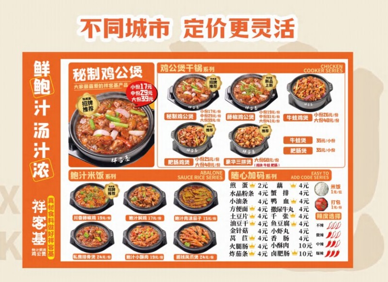 祥客基,一个承载着9年匠心与热爱的餐饮品牌,始终秉持着“用真材实料,做好祥客基”的初心,致力于为每一位顾客带来健康美味的快餐美食体验。我们的故事始于1920年,由名厨戴煜以独特鲍汁技艺闻名。他选用上等食材与鲍鱼共煲,创造出鲜美四溢的鲍汁,迅速在花楼街走红赢得广泛好评。2017年,第三代传人戴旭祥继承并发扬了这一传统,正式命名品牌为“祥客基”。在武汉开设了第一家祥客基鲍汁肥牛鸡公煲,以招牌肥牛饭和秘制鸡公煲迅速俘获了食客的心。
