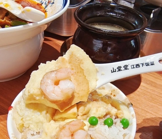 山堂堂江西下饭菜鲜辣开胃吃几口就开始冒汗,必须配着现蒸的米饭火力全开。电饭煲进门就可以看到一字排开,蒸出的米饭粒粒分明、饱含香气,比一般大米香很多。 |