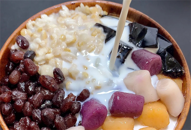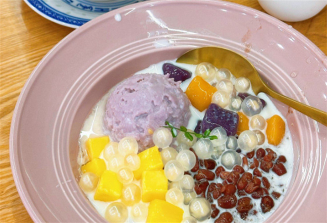 红豆、莲子、芋圆、仙草,满满当当的一大碗,感觉像是在吃甜品界的满汉全席!红豆绵密得入口即化,莲子软糯得仿佛在舌尖上跳舞,芋圆Q弹得像在嚼橡皮糖,仙草爽滑得就像在舔冰淇淋,每一口都是满满的幸福感!糖水铺汤汁也是一绝,奶香浓郁,甜而不腻,淋在配料上,瞬间让整碗糖水都升级了!每一口都是对味蕾的极致诱惑! |